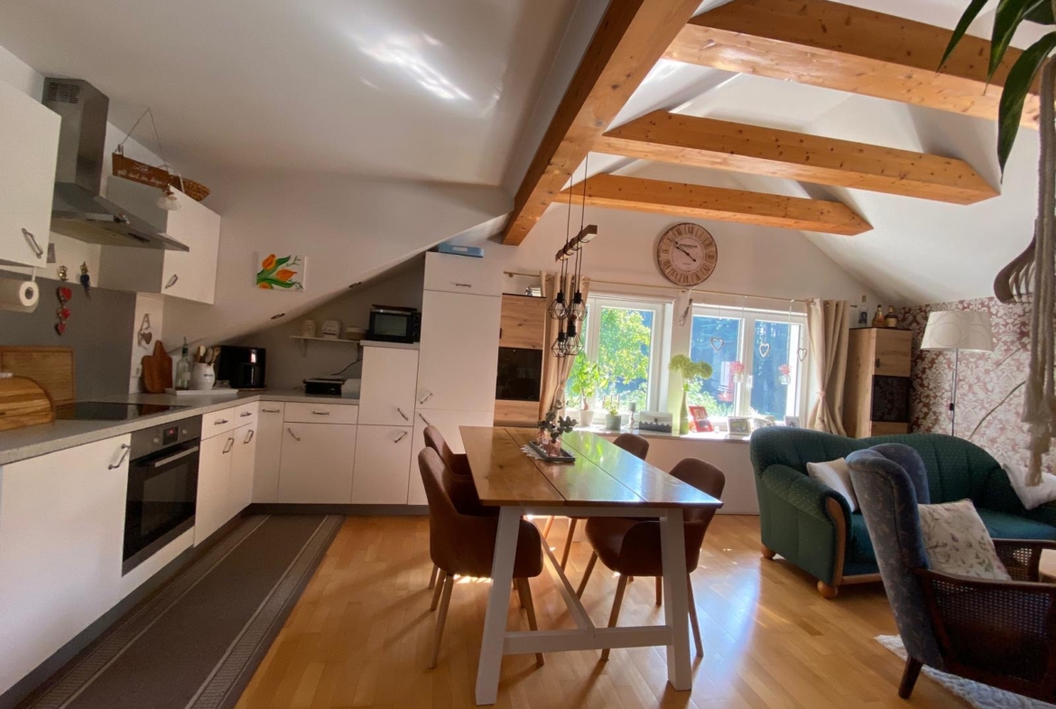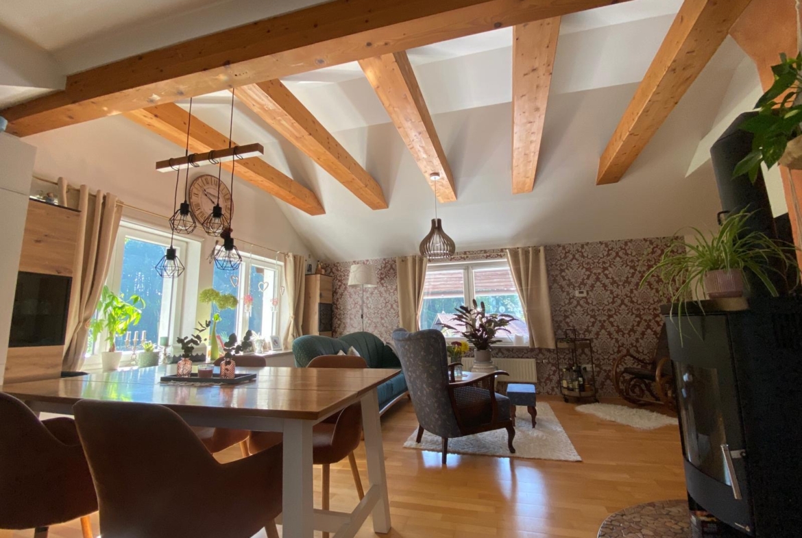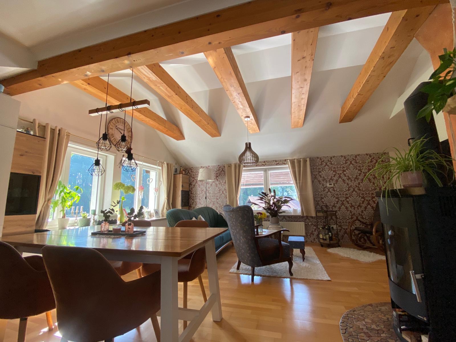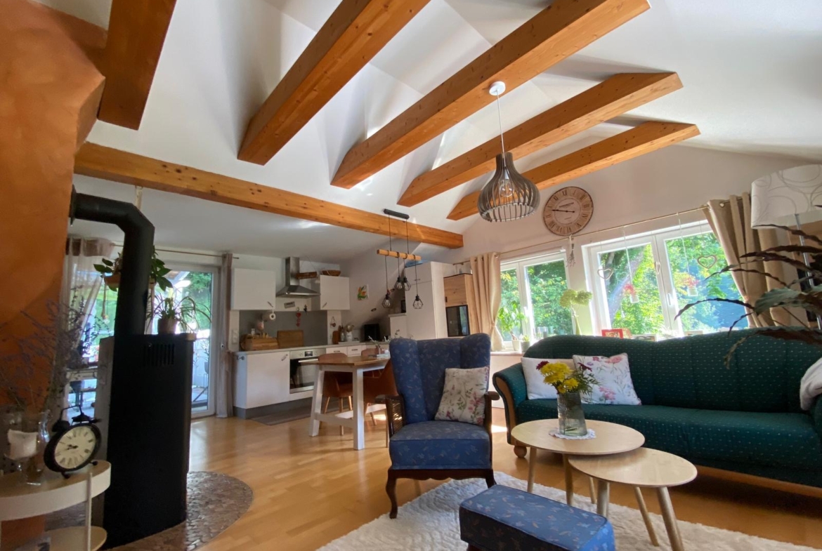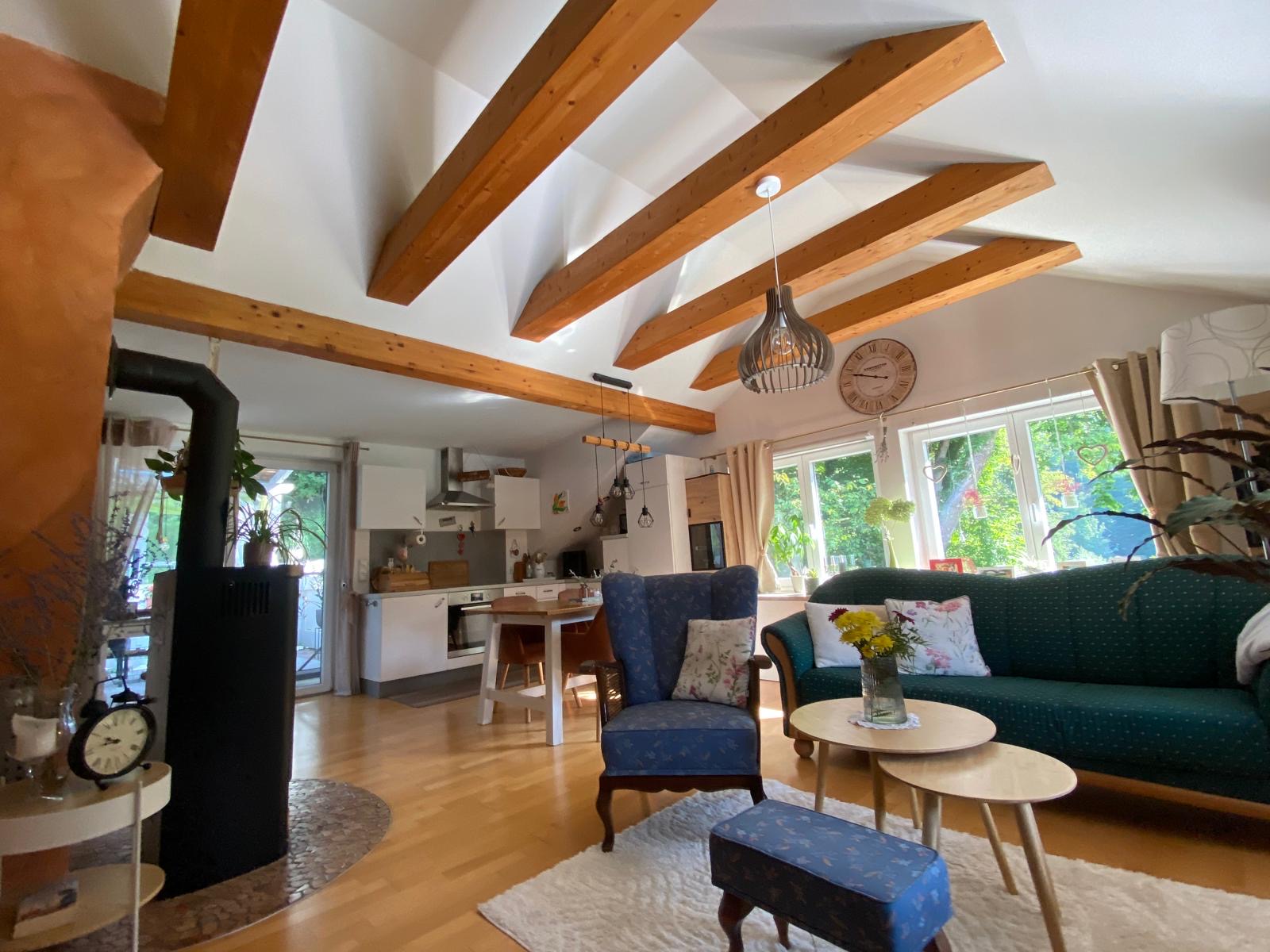 Die Wohnung im 2. Obergeschoss bietet rund 80 m² Wohnfläche, zwei Schlafzimmer, ein helles Badezimmer mit Wanne und Dusche sowie eine offene Wohnküche mit sichtbaren Holzbalken. Ein Schwedenofen sorgt für wohlige Wärme und gemütliche Stunden.