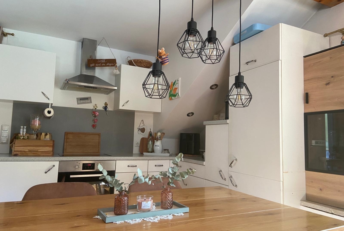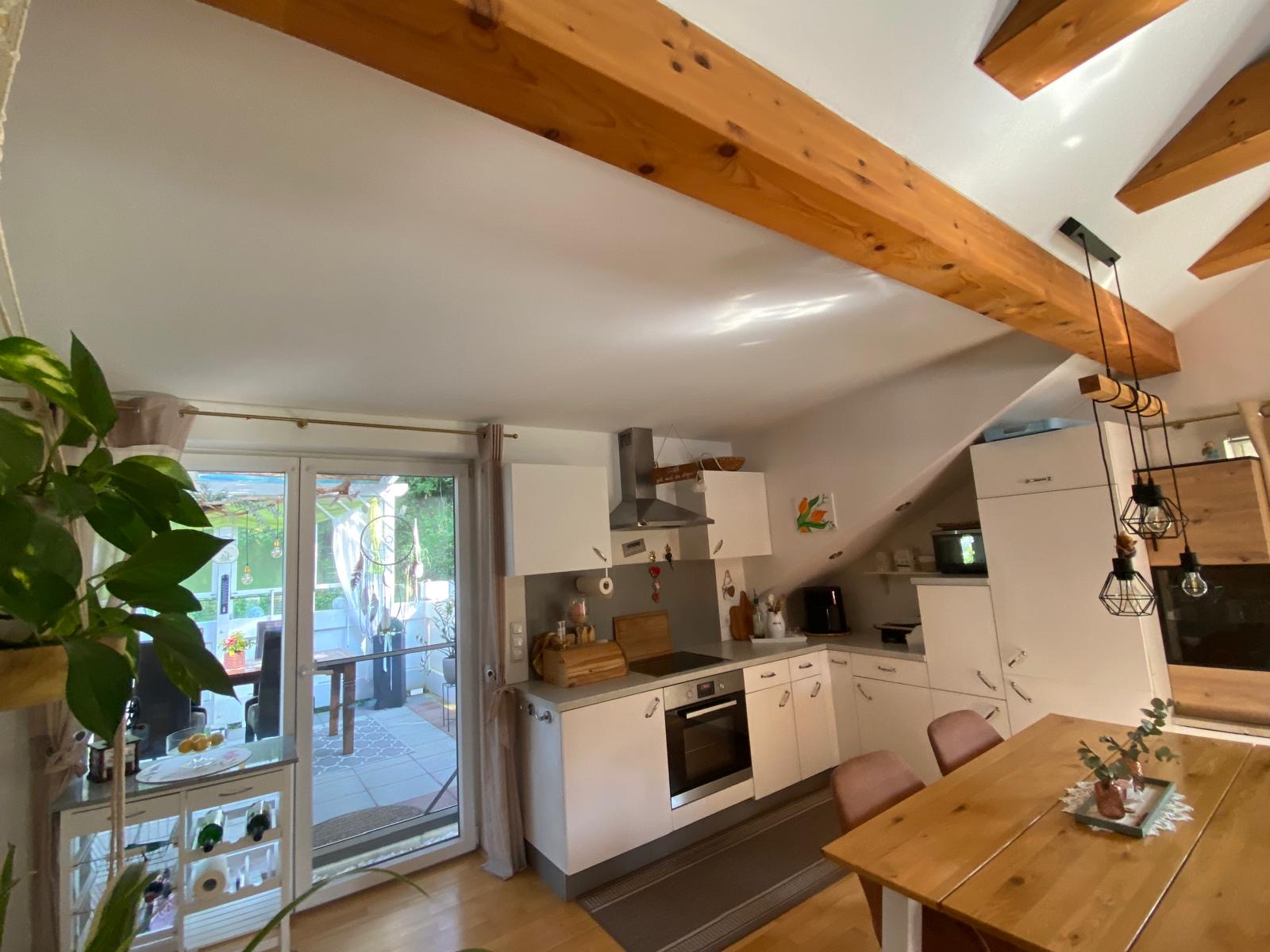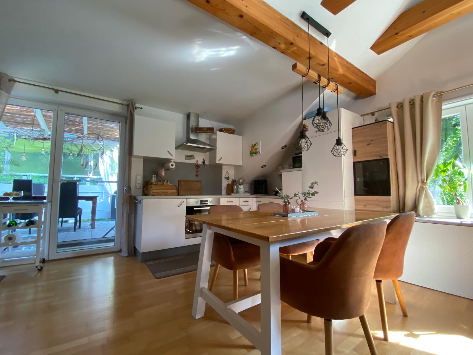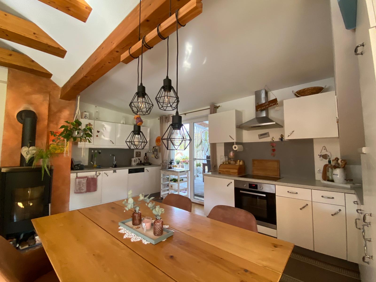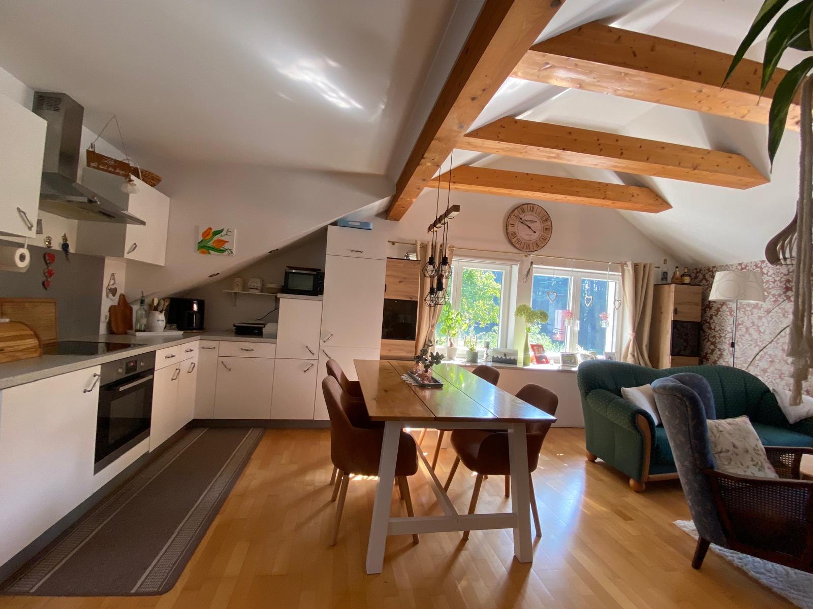 Die Wohnung im 2. Obergeschoss bietet rund 80 m² Wohnfläche, zwei Schlafzimmer, ein helles Badezimmer mit Wanne und Dusche sowie eine offene Wohnküche mit sichtbaren Holzbalken. Ein Schwedenofen sorgt für wohlige Wärme und gemütliche Stunden.