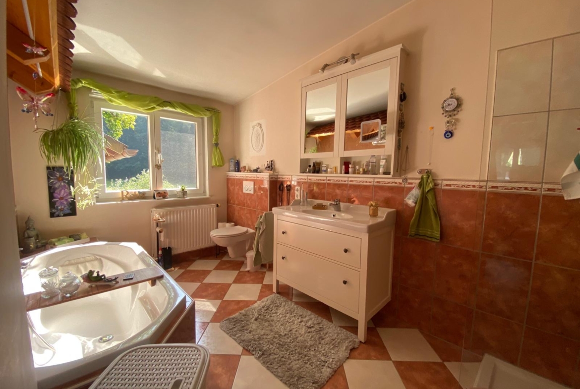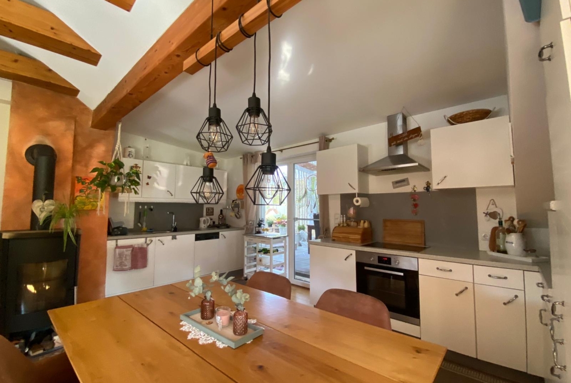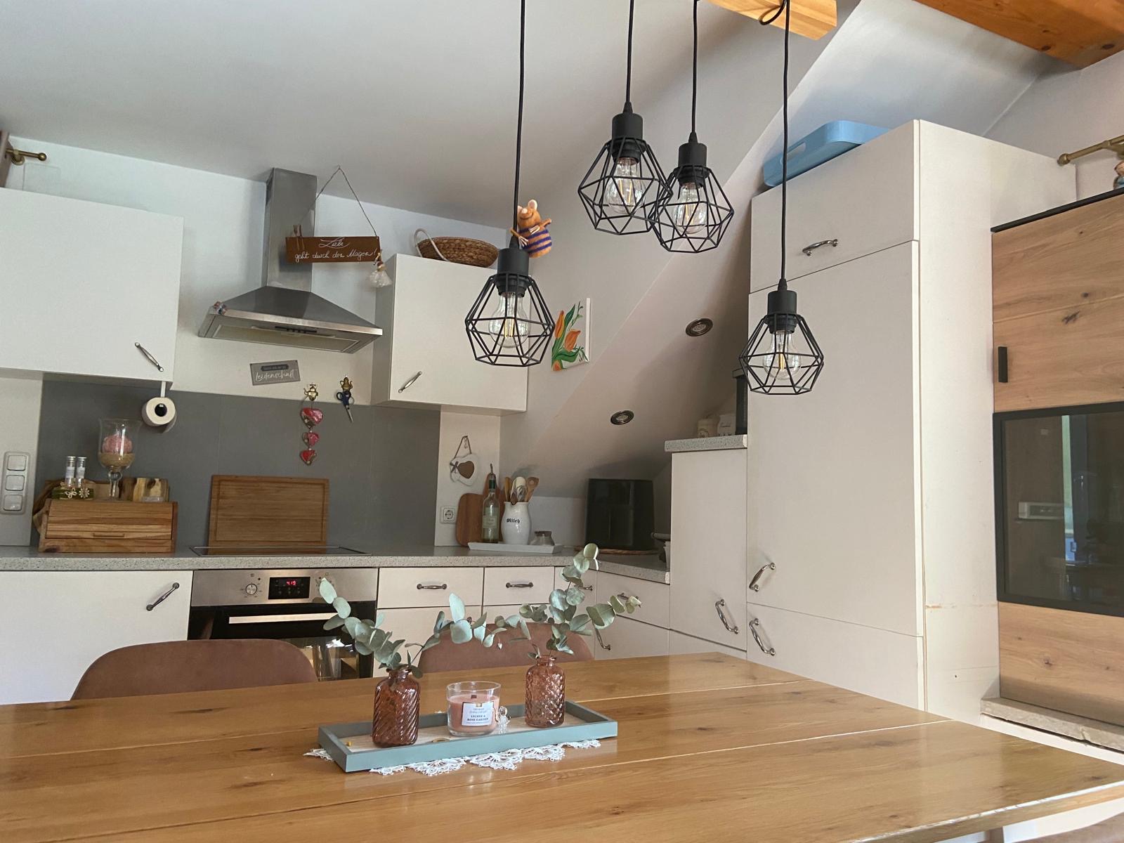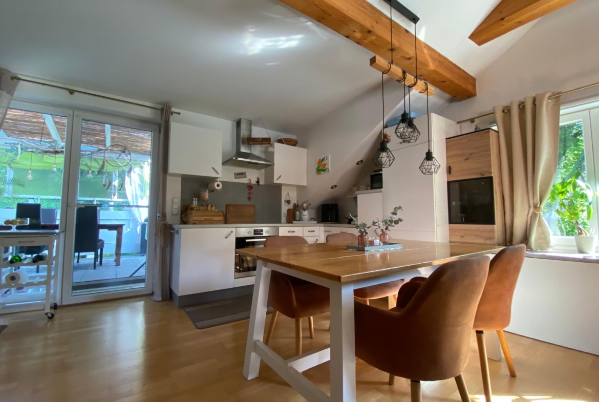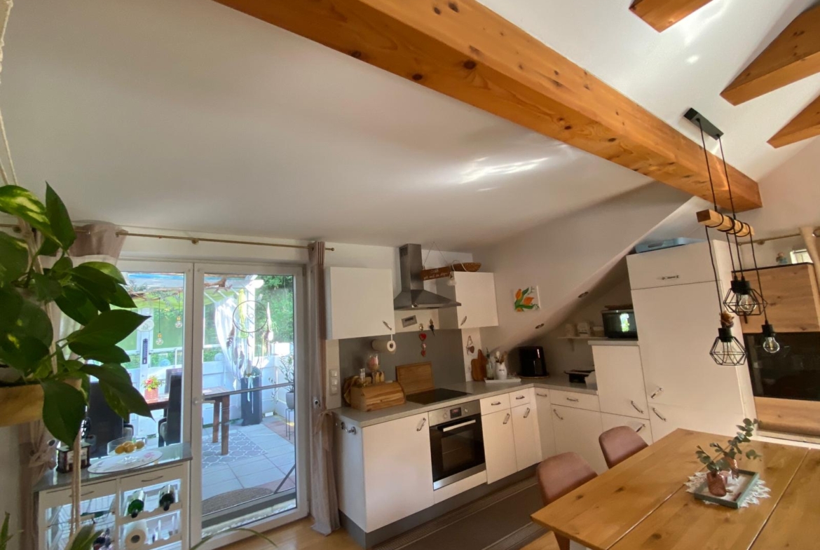 Die Wohnung im 2. Obergeschoss bietet rund 80 m² Wohnfläche, zwei Schlafzimmer, ein helles Badezimmer mit Wanne und Dusche sowie eine offene Wohnküche mit sichtbaren Holzbalken. Ein Schwedenofen sorgt für wohlige Wärme und gemütliche Stunden.